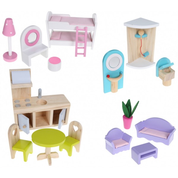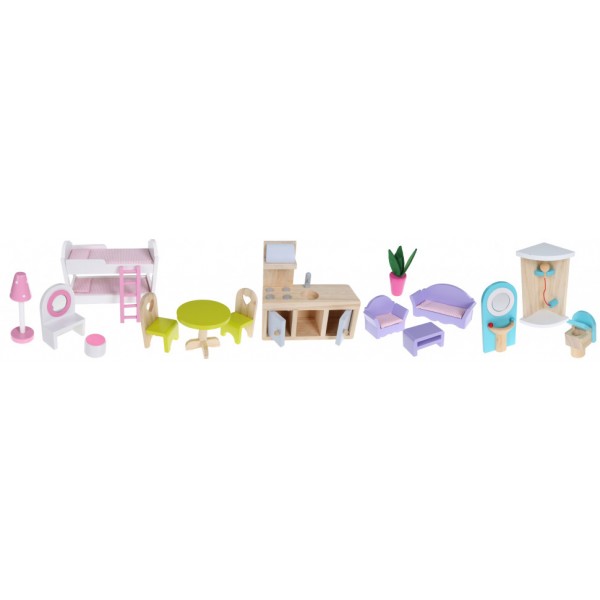 - Комплект мебели из 16 предметов: cтол и 2 стула, диван, кресло и журнальный столик, большой книжный шкаф, душ, умывальник и туалет, два большая двухъярусная кровать лестницы, лампа, качалка лошадь и растение в горшке, 2 куклы.